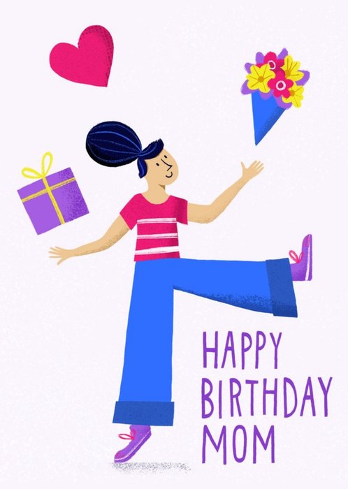 Illustration of a mum balancing a bunch of flowers, heart and present with text.