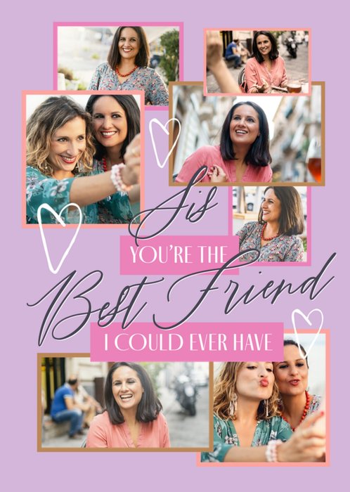 This greeting card design features a soft lavender background with the text “Sis, You’re the Best Friend I Could Ever Have” in a mix of elegant script and serif fonts. The card includes six rectangular photo upload areas with pink and gold borders, scattered across the design: one at the top left, one at the top right, two in the centre overlapping the text, and two at the bottom. Hand-drawn white hearts add a playful and affectionate touch to the composition.