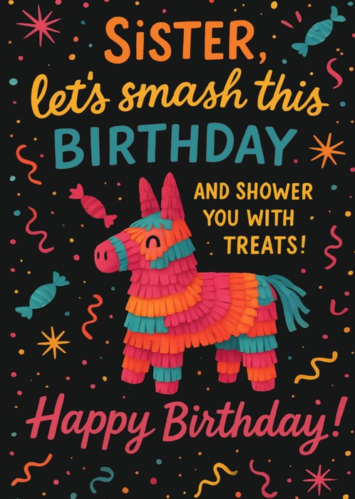 Featuring a colourful piñata donkey with confetti, streamers, sweets and bold hand-lettering, on a black background.