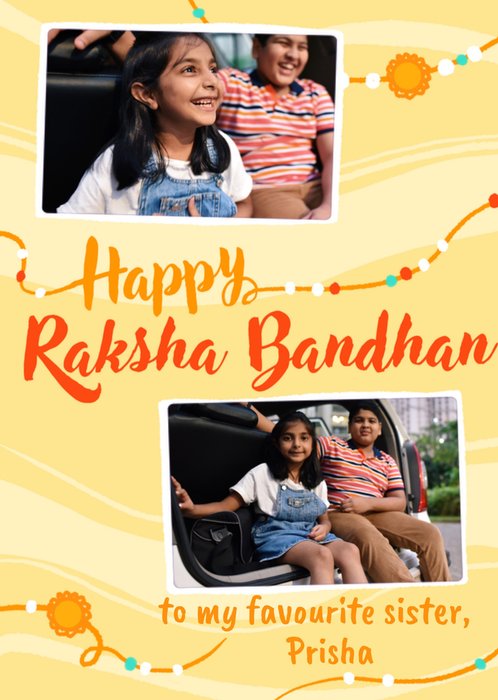 "Happy Raksha Bandhan to my favourite sister, Prisha". 'To my favourite sister, Prisha' can be personalised!