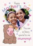 Front of card: Featuring an illustration of Moonpig wearing a bear costume. Text reads: "Happy Mother's Day you are so beary special to me Mummy!". 'Mummy!' can be personalised!