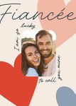 A minimal Valentine's Day card featuring a central photo upload area, with script text above and below, and large hearts in the background.