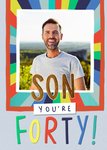 Front of card: Featuring colourful, hand-painted effect typography with one rectangular photo upload frame. The card is adorned with decorative vertical painted lines in various colours emanating outwards behind the frame. It’s a personalised card celebrating a Son with enthusiasm and admiration.
