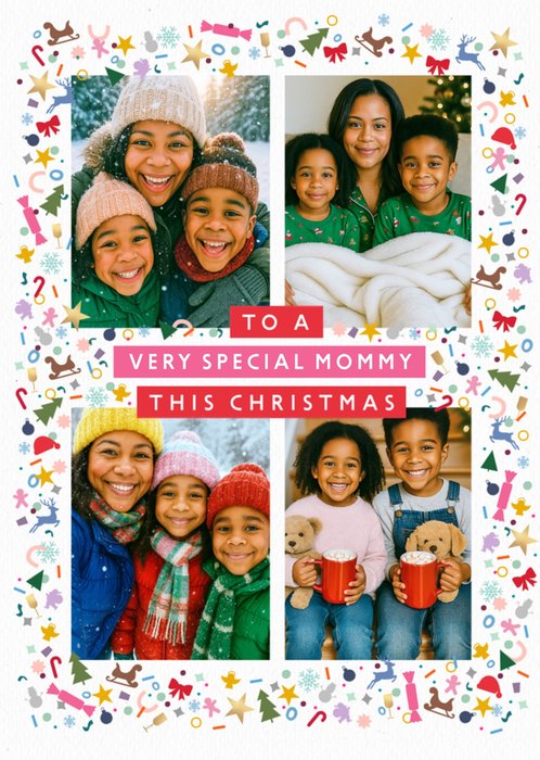 Featuring four rectangular photo upload frames arranged in a neat grid layout with bold red text banners through the centre. The border is decorated with a colourful Christmas-themed pattern including stars, snowflakes, holly, candy canes, baubles, and festive icons on a white background, creating a cheerful and playful look.