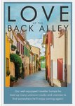 Spoof book cover design featuring an illustration of a quaint back street. The title of the book is Love Up The Back Alley. The non editable caption reads Our Well Equipped Traveller Humps His Load Up Many Unknown Nooks And Crannies To Find Somewhere He'll Enjoy Coming Again.