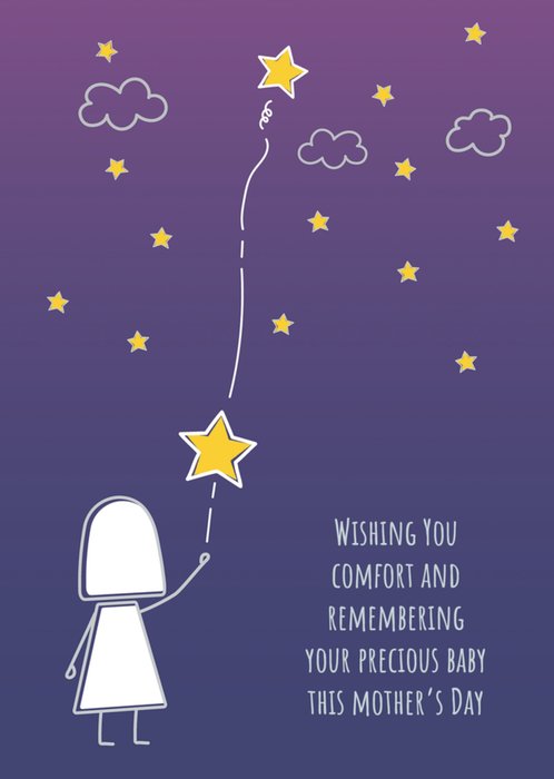 A tender Mother’s Day card featuring a childlike figure releasing a star balloon into a starry night sky, symbolising remembrance and love for a lost baby.