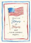 Front of card: Traditional watercolor painted card featuring a central stars and stripes United States of America flag, with handlettered text below. Text reads: "Here's to stars and stripes and warm summer nights."