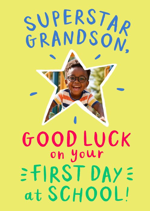 A playful design featuring a star-shaped photo frame with hand-lettered text and small doodle lines on a yellow background.