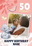 Tatty Teddy 50 Today! Happy Birthday Nan! Photo Upload Card. Illustration of Tatty Teddy with arm outstretched holding up a butterfly. One Photo Upload Frame in the middle of the Card. On a white and pink background surrounded by butterflies. Text reads: "50 Today!" Happy Birthday Nan!". "50" and "Happy Birthday Nan!" Is editable.
