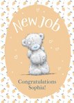 Me To You Tatty Teddy design featuring an orange oval panel that sits in the middle of the card, with Tatty Teddy standing in it, surrounded by white outlined lovehearts. The card backgound is white with a pattern of lemons and flowers. The non editable caption reads New Job, followed by the editable Congratulations Recipient's Name.