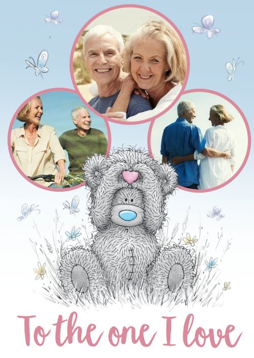 Front of card: Tatty Teddy is sitting down in a bed of flowers and grass, butterflies flying around him and he is holding heart on his head. There are 3 photo upload circles.