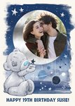 Tatty Teddy is holding a star within it's paws, next to a photo upload framed within a sickle moon. Tatty is surrounded by planets and stars on a painted blue background.