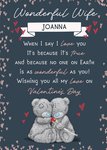 This Tatty Teddy Valentine’s Day card features a navy blue background adorned with pink heart motifs along the borders. The design highlights two Tatty Teddy bears sitting together at the bottom of the card, holding a single red rose. The card includes a personalised banner at the top with the recipient’s name, followed by romantic text in elegant white and pink fonts, expressing love and admiration for a “Wonderful Wife.”