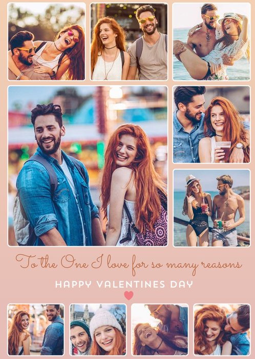 Front of card: Photo Upload Valentine's Day Card Ten photo frames on a light pink background. Text reads: "To the one I love for so many reasons happy Valentine's Day". 'To the one I love for so many reasons' can be personalised!