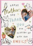 A charming and heartfelt Mother’s Day card featuring adorable hand-drawn illustrations of various pets, including a cat, fish, hamster, and tortoise, along with two heart-shaped photo frames. The message expresses gratitude for putting up with all the antics, making it a perfect card for animal-loving mums.