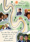 A personalisable Father's Day card featuring an illustrated winding road with a small orange car, trees, and several shaped photo frames. It includes a heartfelt message about guidance and support, making it ideal for celebrating a father’s role through life’s journey.