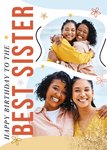 Front of card: Features two photo upload areas in abstract shaped frames, surrounded by coloured shapes and doodle style stars and flowers. At the bottom is gold glitter overlaid on the photo upload.