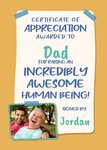 "Certifcate of appreciation awarded to Dad for raising an incredibly awesome human being! Signed by Jordan"