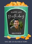 Card shows an illustration of a tin of beans. On the label of the tin it says 'Happy 21st' which is editable, this is followed by birthday (non editable). In the center of the label there is a photo upload circle and below there is editable text which says 'Brother'. At the bottom of the card there is text that says 'You Are An Old Bean Now!', this is also editable!