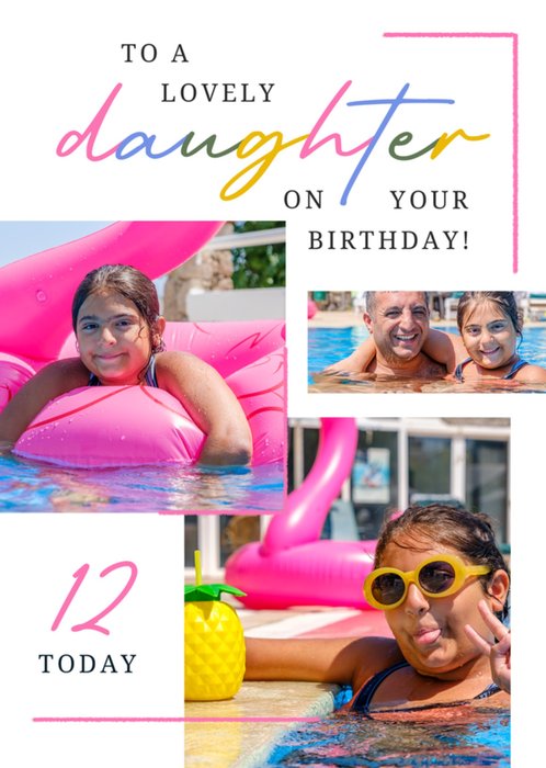 Front of card: Featuring colourful typography with a collage of three photo frames on a white background. Text reads: "To a lovely daughter on your birthday! 12 today".