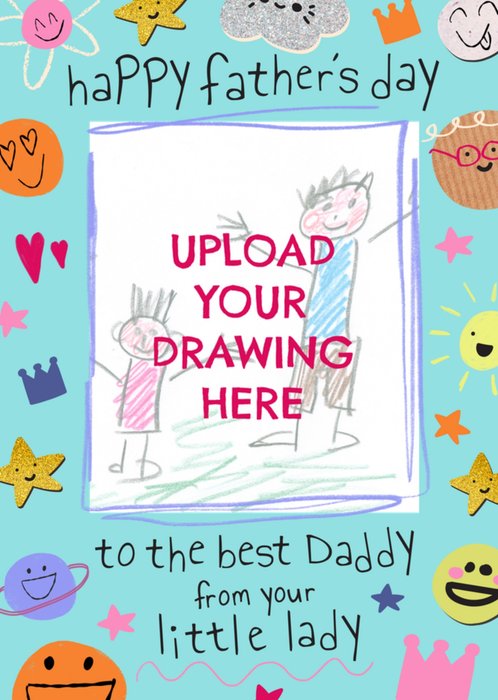 A sweet, light blue greeting card adorned with cute, childlike doodles like stars and planets. Features a large, central rectangular frame with a sketched border, perfect for uploading a custom drawing.