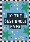 Featuring bold text in the centre surrounded by stars inside a checkered border on a light blue background.