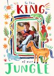 A wild and colourful greeting card with a cream background features a rainbow-striped photo frame surrounded by playful jungle creatures, paw prints, and bold text celebrating the “King of our jungle.”