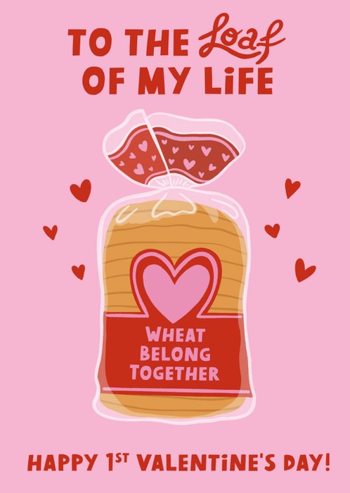 This playful Valentine’s Day card features a pink background with a whimsical illustration of a loaf of bread in a bag decorated with hearts, paired with pun-based text expressing love and warmth. The card reads: “To the loaf of my life,” “Wheat belong together,” and “Happy 1st Valentine’s Day!”
