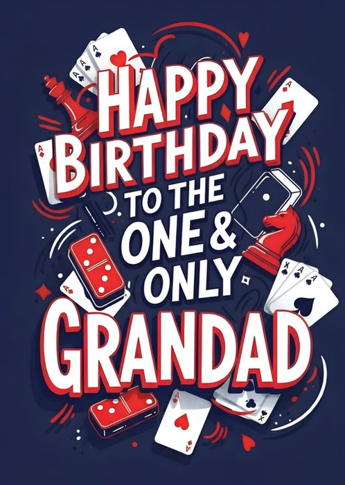 A modern typographic design featuring bold lettering surrounded by playing cards, domino tiles and chess pieces on a dark blue background.