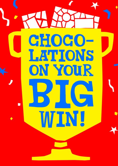 A vibrant celebration card with a red background, filled with confetti and stars. At the centre, a bold yellow trophy features playful blue text, with stylised chocolate bars popping out the top. The design conveys excitement and humour.