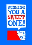A bright blue card with bold graphic illustration of a chocolate bar. A white speech bubble holds the main text in blue and red fonts.