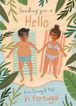 Text reads: "Sendin gyou a hello from Danny & Mel in Portugal."
