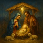 Featuring a traditional nativity scene with Mary, Joseph, baby Jesus in a manger, two lambs, and a bright star above, on a dark blue background.