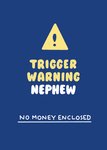Features a yellow warning triangle, with yellow and white text below it, on a blue background.This humorous card is perfect for a lighthearted birthday wish to your nephew.