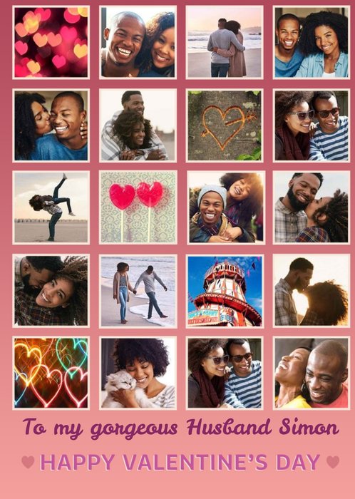 Front of card: Photo Upload Valentine's Day Card 20 photo frames on a light pink background. Text reads: "To my gorgeous husband Simon happy Valentine's Day". 'To my gorgeous husband' can be personalised!