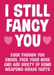 The card reads: "I still fancy you, even though you snore, pick your nose and are guilty of some weapons-grade farts".
