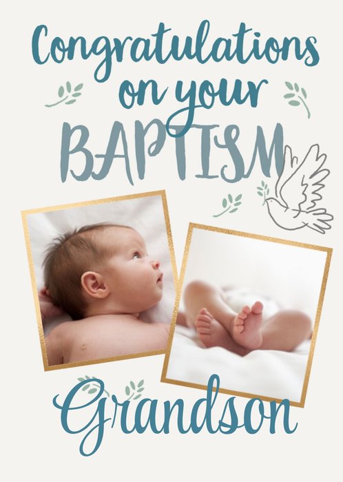 Congratulations on your Baptism is written in a large calligraphy type font above two photo upload boxes. Below text reads: 'Grandson', this can be personalised!
