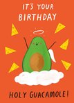 Illustration of a big Avocado, Nachos and text on an orange background.