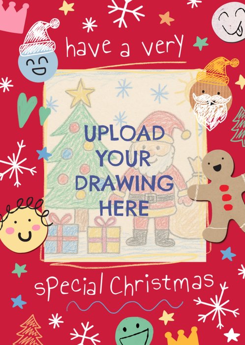 Featuring 1 photo upload area for a drawing surrounded by festive doodles including santa, a gingerbread figure, smiley faces, stars and snowflakes, on a red coloured background.