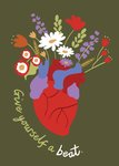 A vibrant and bold V Coterie x Moonpig collab greeting card showcasing a red anatomical heart bursting with a colourful bouquet of daisies, lavender, poppies, and wildflowers, all set against a deep olive green background.