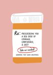 A witty V Coterie x Moonpig collab greeting card designed to resemble a medicine bottle label, offering a playful prescription of courage, confidence, and grit, with bold black and red text on a peachy pink background.