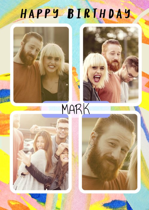 Front of card: An abstract and vibrant Photo Upload Birthday Card featuring four photo upload areas in a 2x2 collage layout. There are hand-painted super colourful expressive brushstrokes in the background.