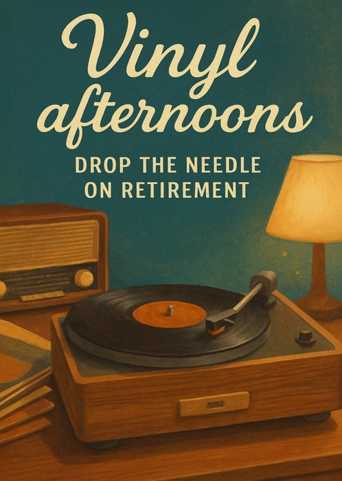 Featuring a record player, a vinyl record, a radio, and a table lamp on a wooden table, this greeting card has a teal background and a warm, vintage music theme.