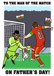 Front of card: Wales Footballer Man Of The Match Father's Day Card Ilustration of Welsh footballer wearing Dad football shirt. Text reads:"To The Man Of The Match On Father's Day"