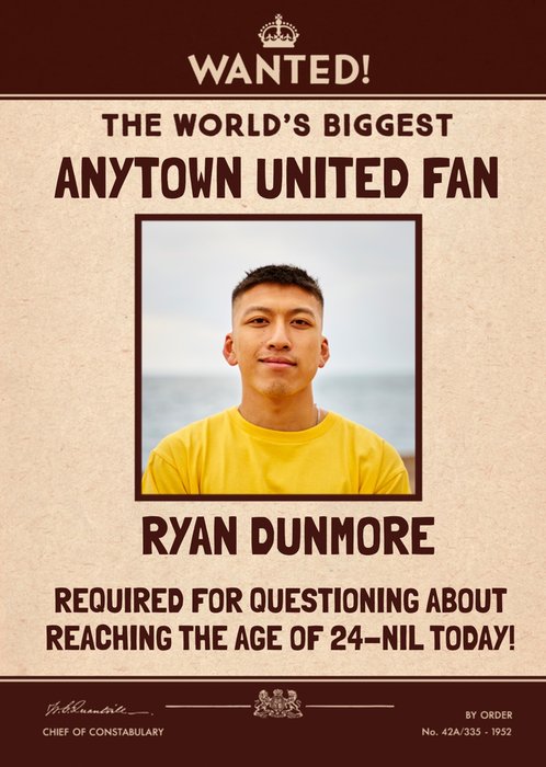 "Wanted the world's biggest Anytown United fan Ryan Dunmore required for questioning about reaching the age of 24-nil today!". 'Anytown United fan' and 'Ryan Dunmore' can be personalised!