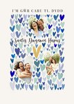 Front of card: A sweet and loving St Dwynwen's Day Photo Upload card featuring multiple hand-painted watercolour love hearts in a rectangle shape in the centre of the design, with text above and buried in the middle of the love hearts. There are three photo upload areas inside heart-shaped frames.