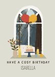A warmhearted and welcoming Birthday card featuring a hand-painted illustration of a cosy wintery window view featuring balloons, a vase of flowers, candles, a Birthday cake and mugs of hot drinks.