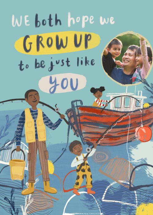 A heart-warming illustrated card showing a father figure fishing with two children beside a rustic red boat, set against a painterly blue seascape. The design includes joyful, textured illustrations and space for a circular photo frame, making it a perfect choice for Father's Day or birthdays to celebrate a special male role model.
