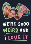 Featuring two heart-shaped photo upload frames with bright green and pink outlines, above bold playful text reading “we’re sooo weird and I love it” with small pink heart icons and green underline details, on a dark navy background.