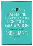 Front of card: 'Congratulations on your Graduation' Card White typography with a mortarboard hat emoji on a teal background. Text reads: "Katherine congratulations on your graduation you're just totally brilliant you are!". 'Katherine' can be personalised!